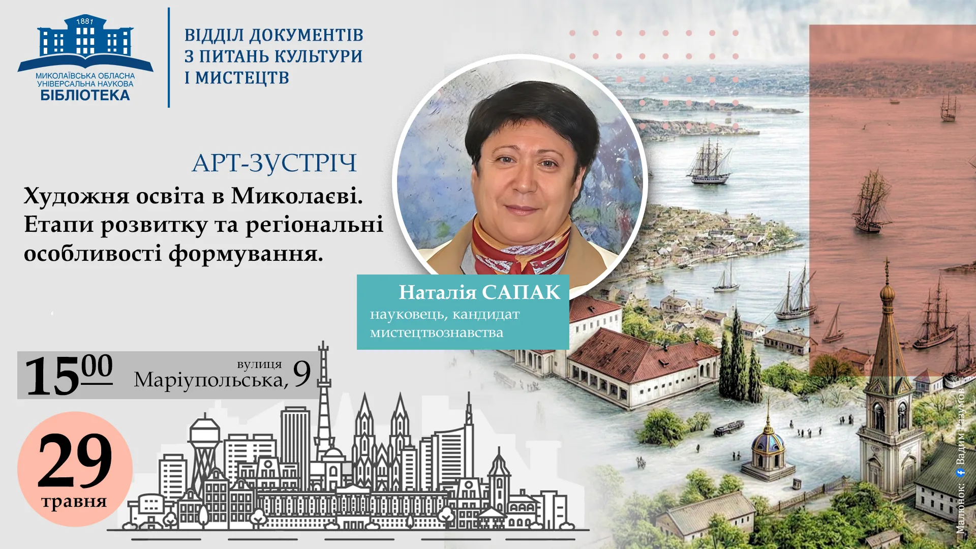 Запрошуємо всіх небайдужих до історії рідного міста до спілкування щодо незвичайно цікавої теми – історії мистецкого життя Миколаєва. Цієї темі буде присвячена арт-зустріч з відомим науковцем, кандидатом мистецтвознавства Наталією Вікторівною Сапак “Художня освіта в Миколаєві. Етапи розвитку та регіональні особливості формування”.