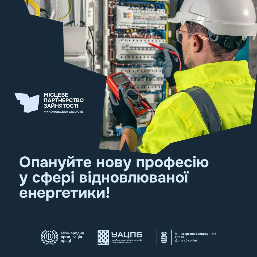 Місцеве партнерство зайнятості у Миколаївській області оголошує набір на короткостроковий курс за професією 🔸️«Електромонтажник з освітлення та освітлювальних мереж» 🔸️(часткова професійна кваліфікація «Обслуговування відновлювальних джерел енергії (сонячна енергетика)»).