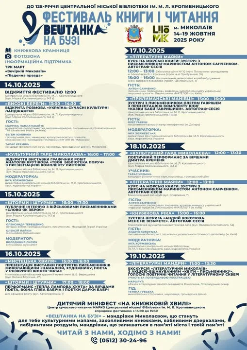 Центральна бібліотека ім. М. Л. Кропивницького запрошує миколаївців та гостей міста на Фестиваль книги і читання “Вештанка на Бузі”