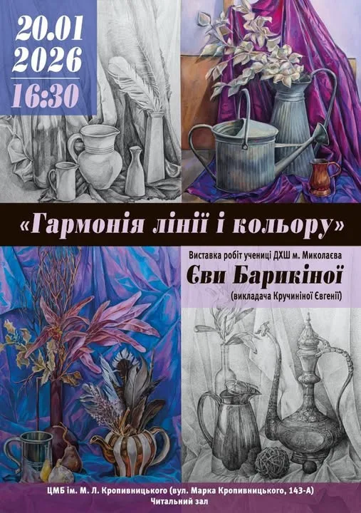 Запрошуємо на художню виставку «Гармонія лінії і кольору», де представлені графічні та живописні роботи, що поєднують точність лінії, глибину форми та емоційну силу кольору.
