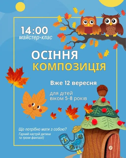 Запрошують маленьких митців віком 5–8 років на майстер-клас «Осіння композиція»!