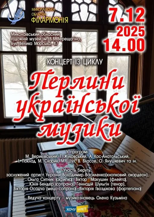 🎶Миколаївський обласний художній музей імені В. В. Верещагіна спільно з обласною філармонією раді запросити вас на чарівний концерт із циклу «Перлини української музики»