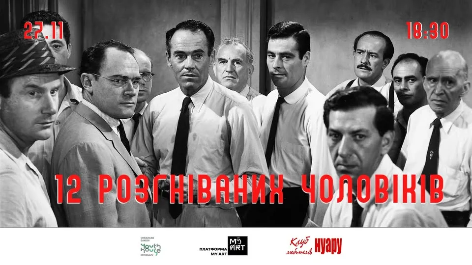 Платформа MY ART спільно з Клубом любителів нуару (м. Херсон) та Українсько-данським молодіжним домом у Миколаєві запрошують на відкритий показ фільму «12 розгніваних чоловіків» Сідні Люмета у Миколаєві.