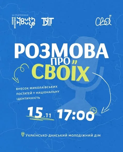 Ця подія відкриває проєкт “Свої”, у межах якого команда презентує створені матеріали про культурних діячів Миколаївщини. На заході учасники поспілкуються із запрошеними спікерами про внесок цих діячів у формування українського культурного простору.
