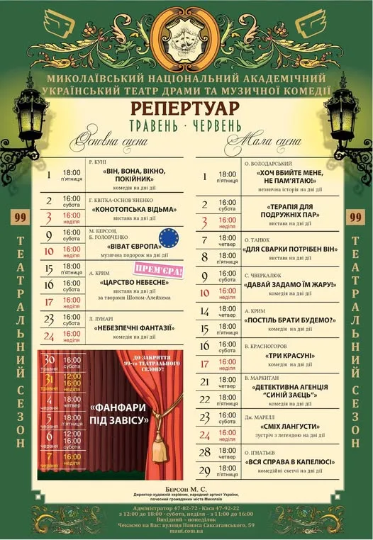 🧐Придбати квитки на травень можна буде в касі театру за адресою: вул. Панаса Саксаганського 59 (телефон каси +38 0512 47 92 22)