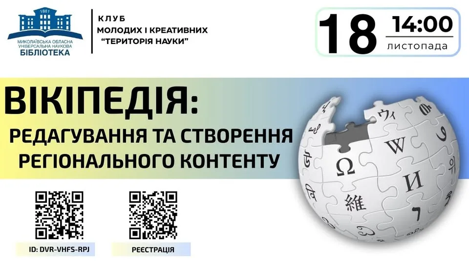 В онлайн-форматі відбудеться засідання Клубу молодих і креативних «Територія Науки» Миколаївської обласної універсальної наукової бібліотеки за темою «Вікіпедія: редагування та створення регіонального контенту».
