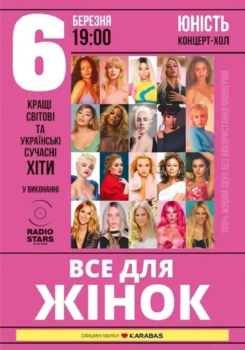 6 березня запрошуємо в концерт-хол Юність на спеціальну святкову жіночу програму світових та українських сучасних супер-хітів улюблених зірок у виконанні гурту RadioStars та кількох солістів – 100% живий звук без фонограм