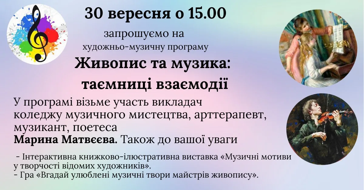 30 вересня – Всеукраїнський День бібліотек, а професійне свято завжди дуже приємно відмічати разом з друзями за спілкуванням на дуже цікаву тему. Запрошую друзів відділу документів з питань культури і мистецтв до спілкування на захоплюючу тему взаємодії музики та живопису. Так, ця тема просто неосяжна. Це і кольоровий слух, або синестезія, різноманіття музичних тем у живопису відомих художників. Думаю, у святковий день не варто проводити лекцію, мабуть просто пограємо?
